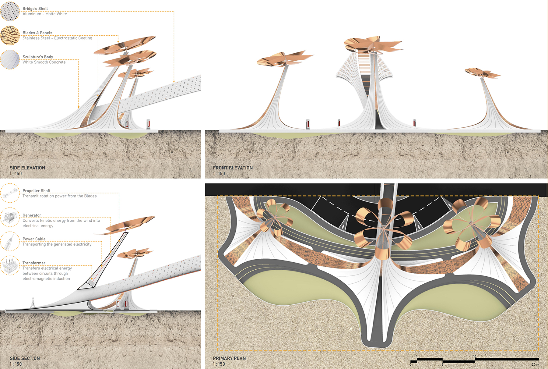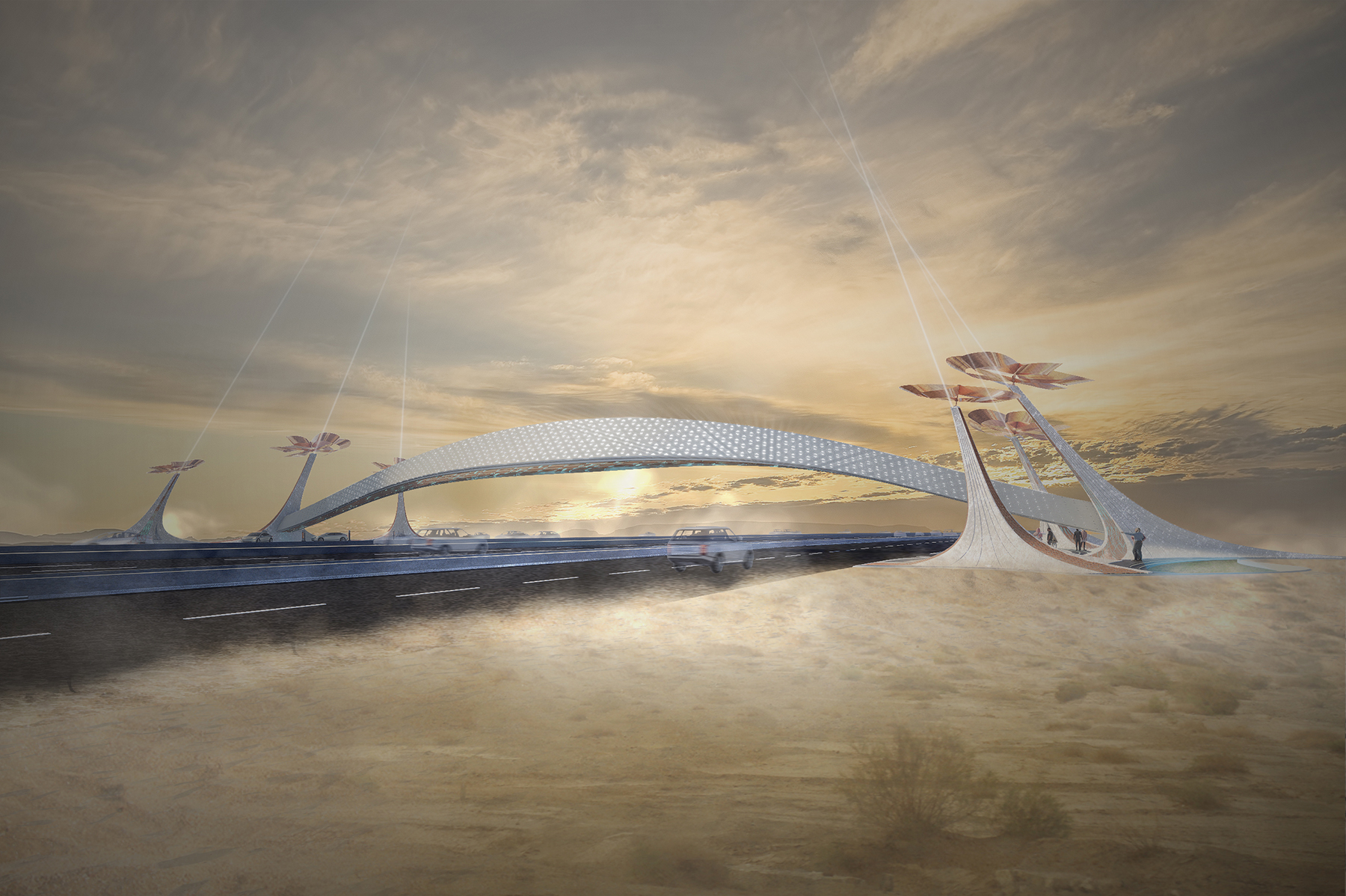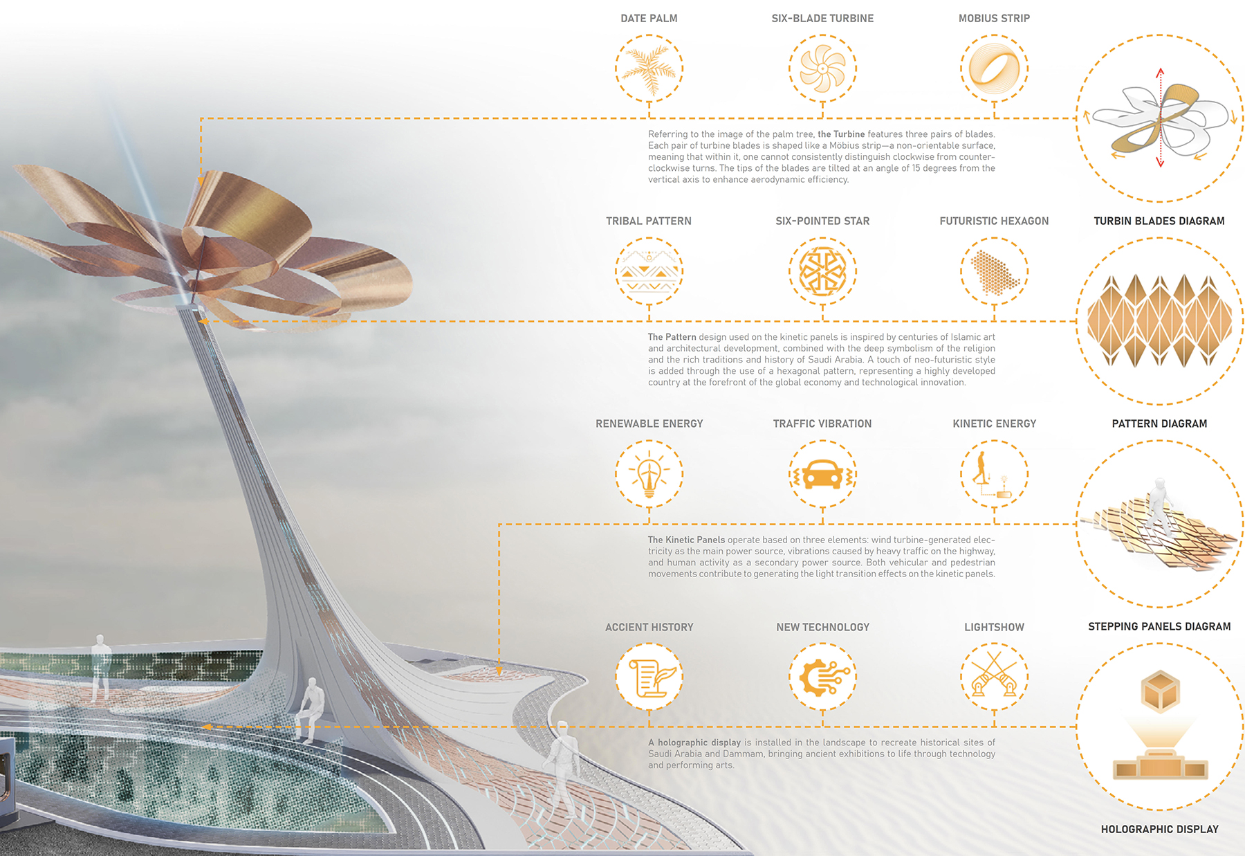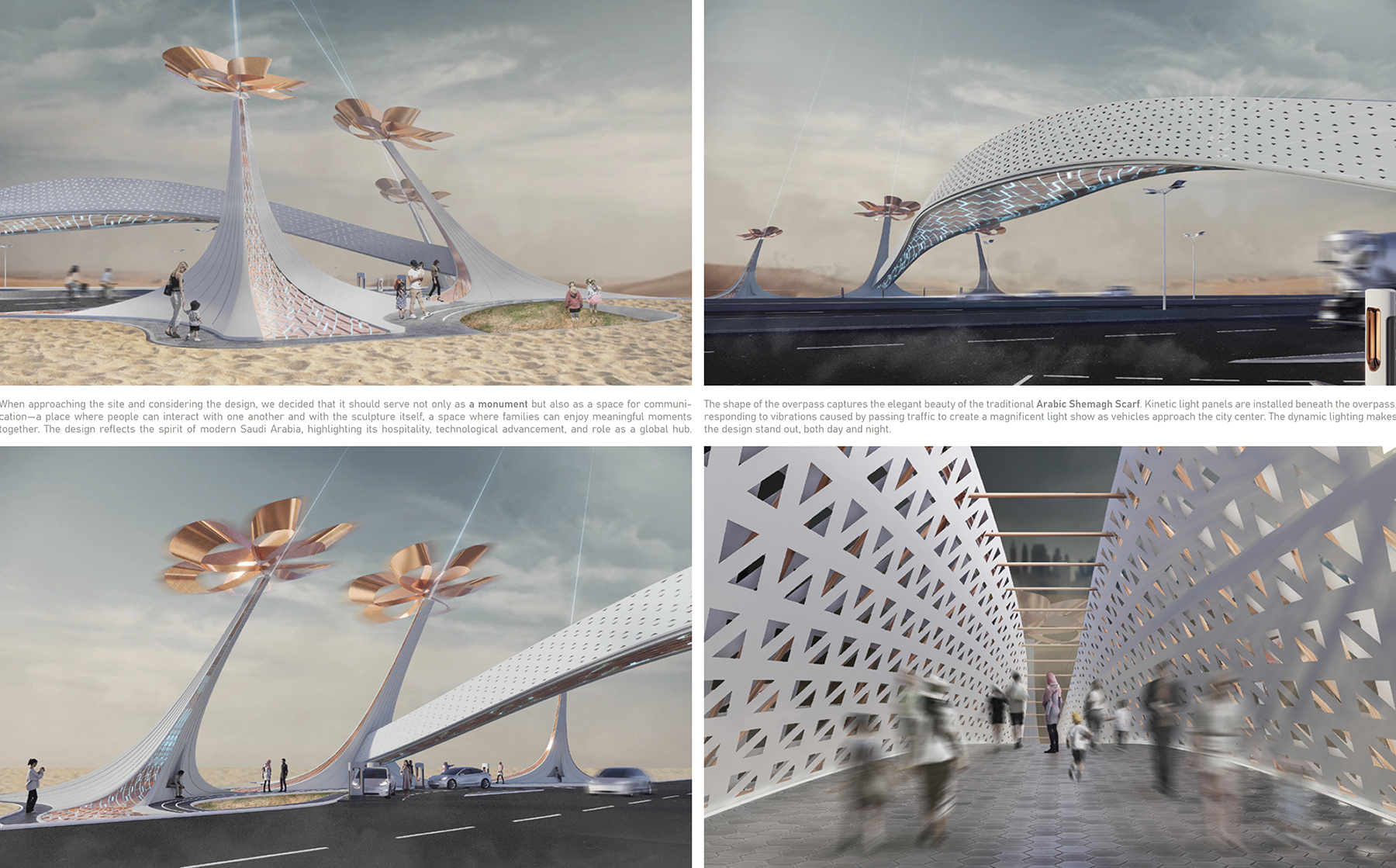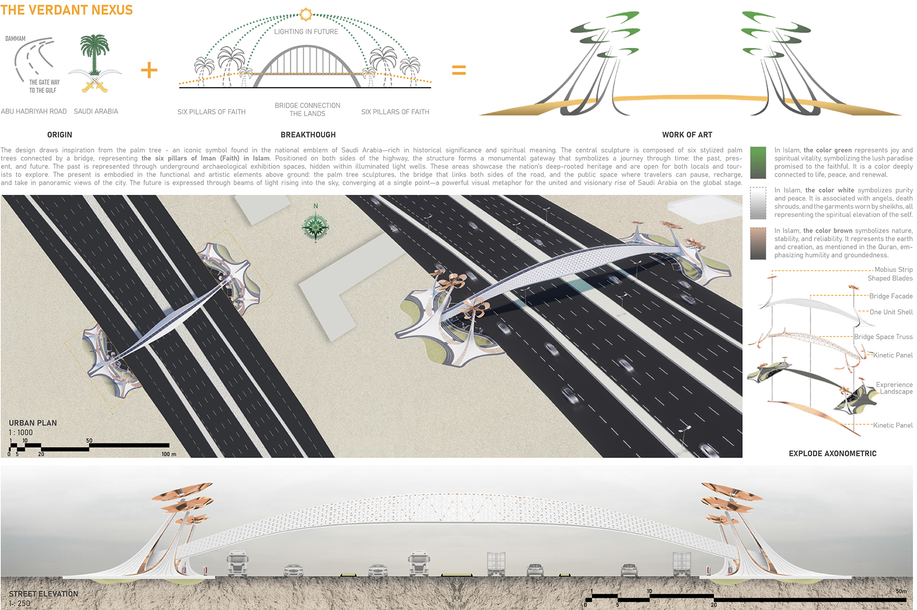 The design draws inspiration from the palm tree - an iconic symbol found in the national emblem of Saudi Arabia—rich in historical significance and spiritual meaning. The central sculpture is composed of six stylized palm trees connected by a bridge, representing the six pillars of Iman (Faith) in Islam. Positioned on both sides of the highway, the structure forms a monumental gateway that symbolizes a journey through time: the past, present, and future. The past is represented through underground archaeological exhibition spaces, hidden within illuminated light wells. These areas showcase the nation’s deep-rooted heritage and are open for both locals and tourists to explore. The present is embodied in the functional and artistic elements above ground: the palm tree sculptures, the bridge that links both sides of the road, and the public space where travelers can pause, recharge,