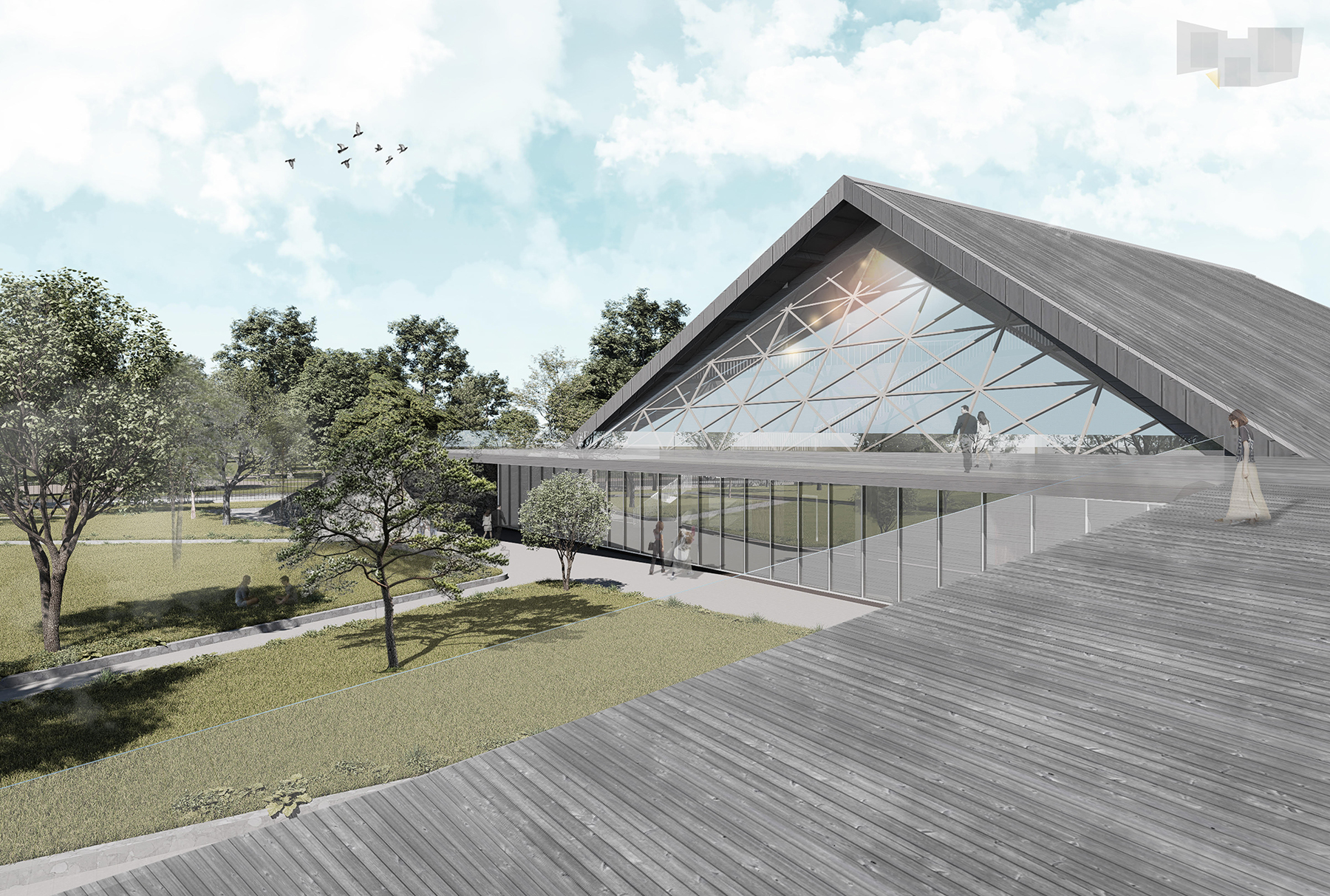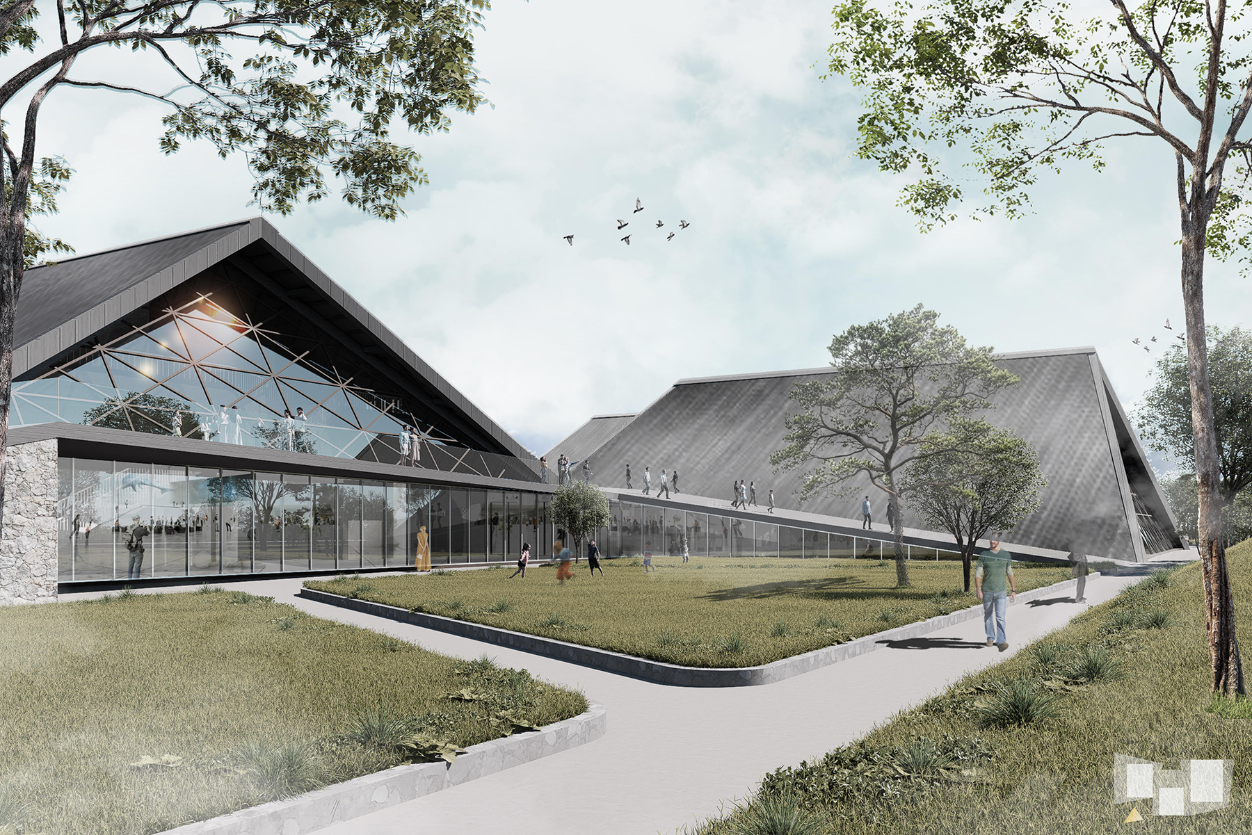The design consists of three main architectural volumes, imagined as the “central houses” of a symbolic village, framing an open marketplace-a space for trade, gathering, and collective life. Here, the image of the mountain hut is not simply transplanted into the city; it is transformed. It speaks not only to form but to memory, to belonging, and to a national story still being written.