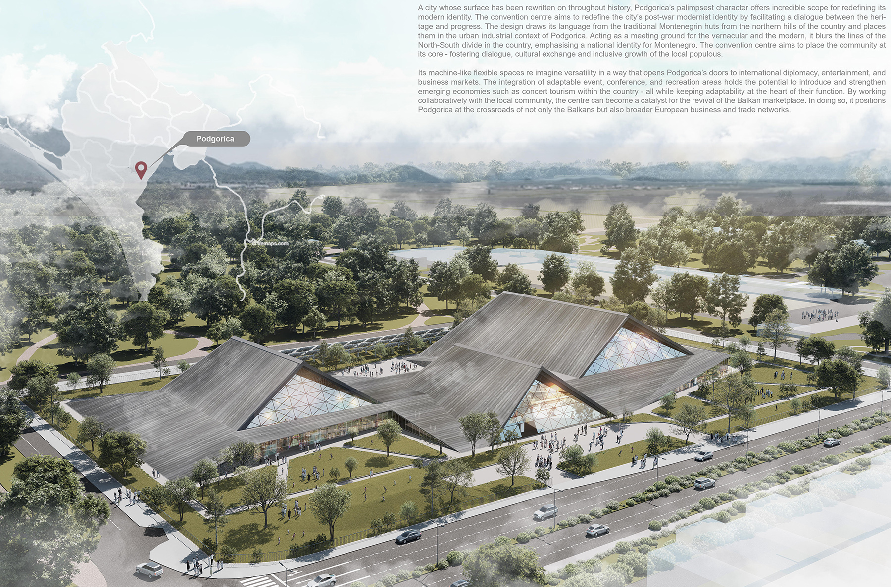 The theme, “Beyond the Ridges” reflects a conceptual and geographical ambition: to transcend both the physical boundaries and the symbolic separations between two contrasting landscapes the modernist urban centre of Podgorica, and the culturally rich, mountainous north of Montenegro.